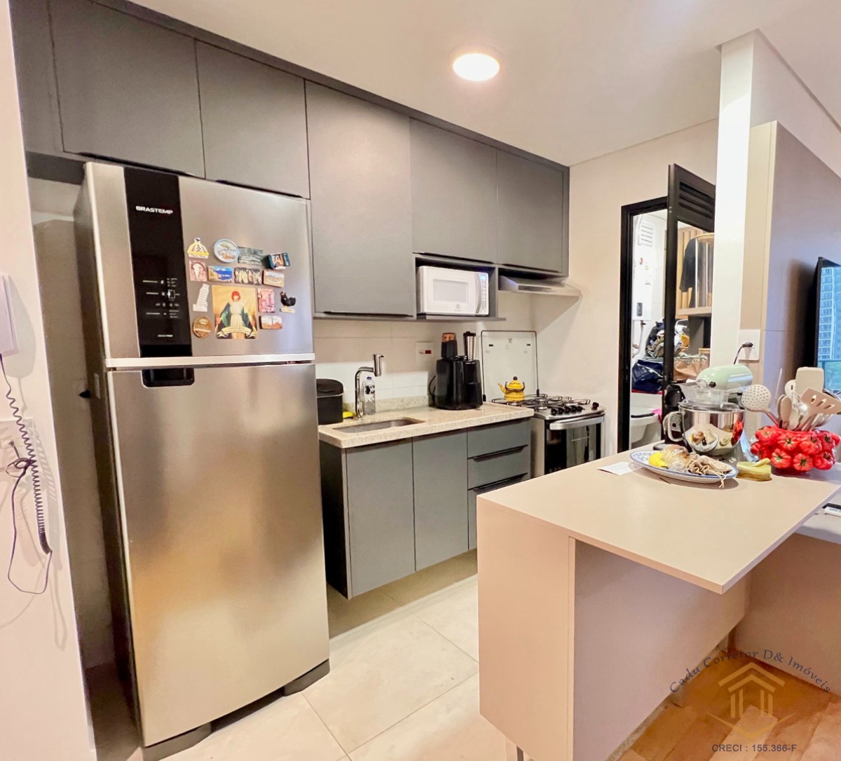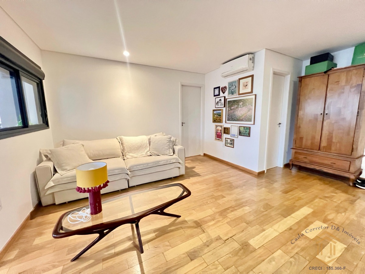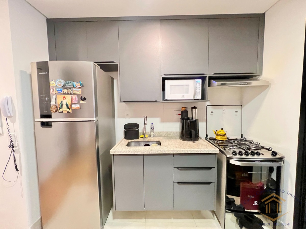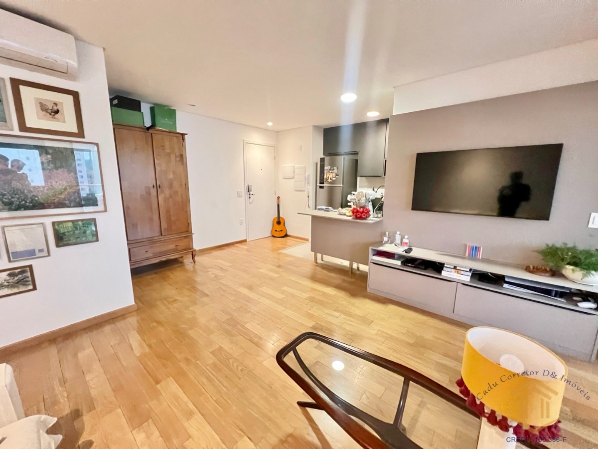 A planta original conta com 2 dormitórios, porém atualmente está configurada com 1 suíte, sala ampliada, cozinha americana, móveis planejados e varanda gourmet fechada com vidro.